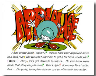 is an entertaining way to learn how to use punctuation. Cool art and interactive stickers makes this a must have for any youngster's library. Mr. Period, the narrator, tells a humorous story in which common punctuation marks are used. After the story he explains that it was his 'Punctuation Pals' that made the story easy to read. He introduces himself as the traffic cop for all written words and shows where and how to use himself. He does the same for his 'Punctuation Pals' in a way that makes there usage easy to understand. All the punctuation marks are color coded (Like this: blue for the period; red for the exclamation mark; green for the question mark, etc.) to aid in learning there placement and proper usage. At the end of the book there is an interactive short story with no punctuation but with specially color coded underscore lines. In the back of the book are reusable punctuation stickers that can be placed and replaced into that story. This book is a lot of fun for all ages! Dr. Hope's Punctuation Pals features delightfully colorful illustrations by cartoonist/illustrator, Richard Pinson.
